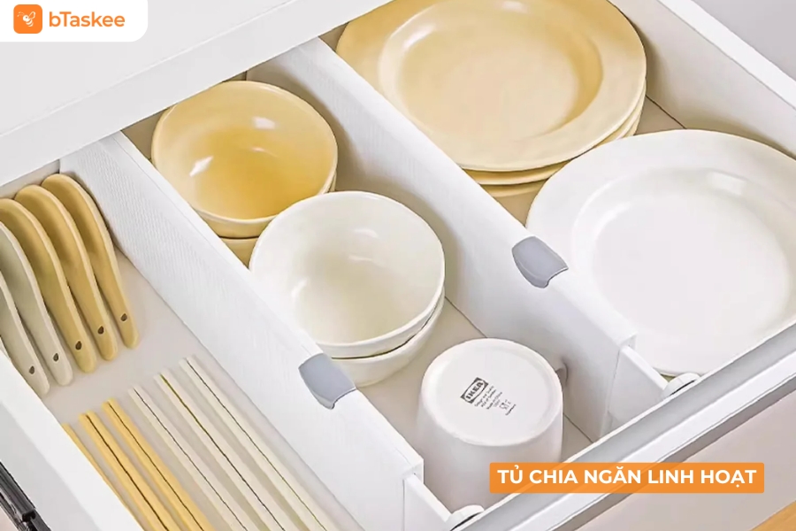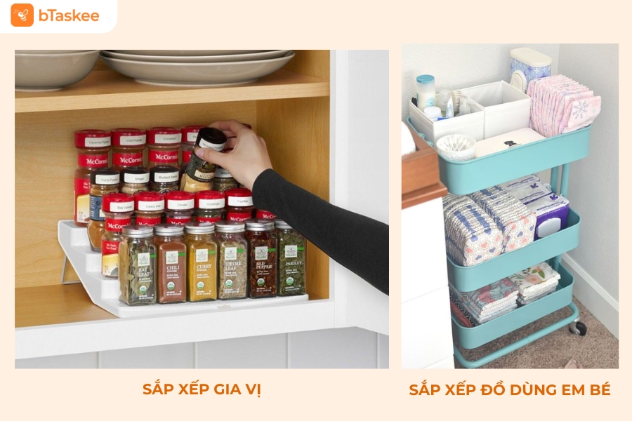 - Phân chia hộp gia vị theo loại (mặn, ngọt, khô, ướt).
