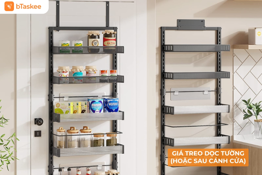 - Giá treo dọc tường đa tầng (dạng lưới hoặc nam châm): Gắn trên cánh cửa, mặt sau tủ, hoặc tường trống trong bếp/phòng tắm. Dùng để đựng chai lọ, khăn lau, gia vị, bàn chải, găng tay cao su. Biến “không gian chết” thành nơi lưu trữ hữu hiệu.
