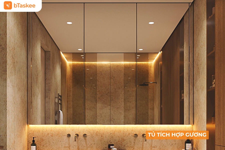 - Tủ lavabo tích hợp gương: Kết hợp công năng lưu trữ và trang trí. Vừa là gương soi, vừa có thể giấu đi các món đồ ít dùng như máy sấy, sạc pin, bình xịt, băng gạc y tế.