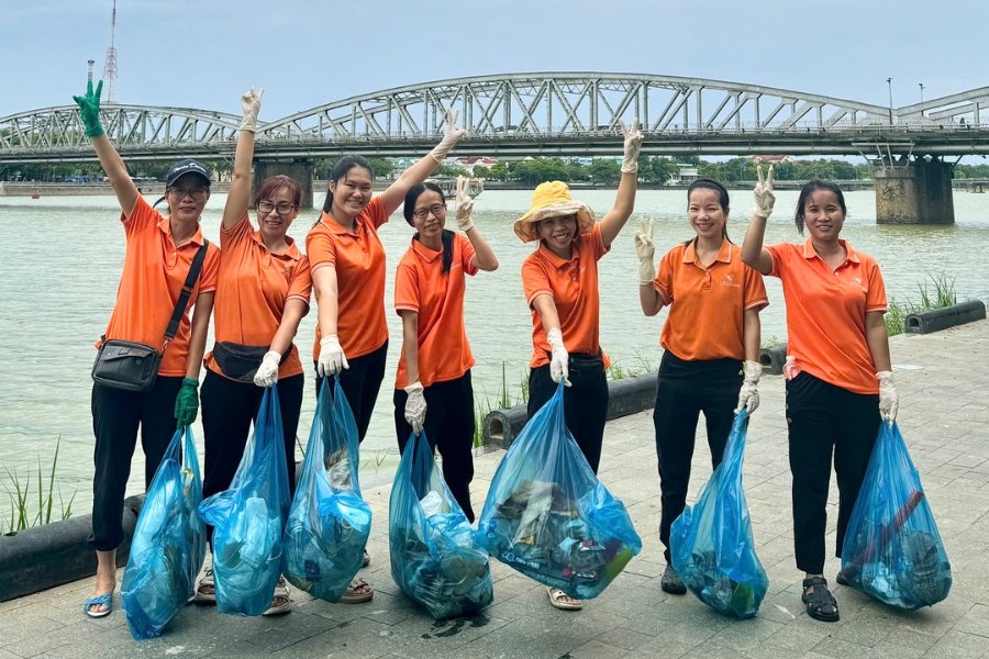Không khí tại Huế trở nên rộn ràng khi các chị Ong cùng nhau xắn tay dọn dẹp môi trường, thu gom rác thải quanh khu vực sông Hương – biểu tượng của sự bình yên và thơ mộng của xứ Huế.