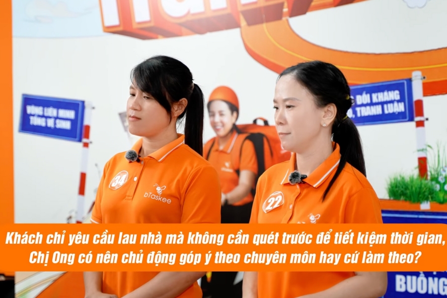 Không khí căng thẳng, nhưng mỗi câu trả lời đều cho thấy sự chuẩn bị kỹ càng và trải nghiệm thực tế của các chị. Có chị khéo léo từ chối yêu cầu ngoài phạm vi công việc bằng lời lẽ mềm mỏng, có chị phân tích rõ hậu quả khi sử dụng hóa chất mạnh lên bề mặt dễ hư hỏng. Có chị chia sẻ chân thành rằng mình từng bị lúng túng khi khách yêu cầu bất ngờ, nhưng giờ đã biết cách trao đổi rõ ràng và giữ sự chuyên nghiệp trong mọi tình huống.