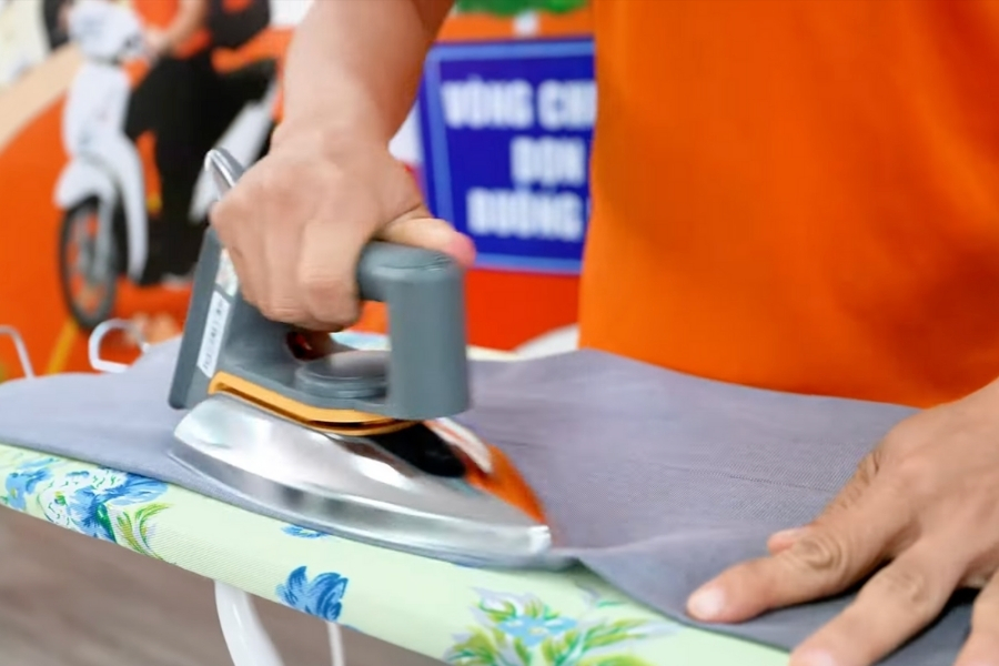 Với quần tây, điều quan trọng nhất là giữ được đường ly thẳng đều mà không làm bóng bề mặt vải. Các chị Ong Cam thường bắt đầu bằng cách lật mặt trái để ủi trước, đặc biệt với những chất liệu tối màu hoặc dễ bắt nhiệt như vải pha poly.