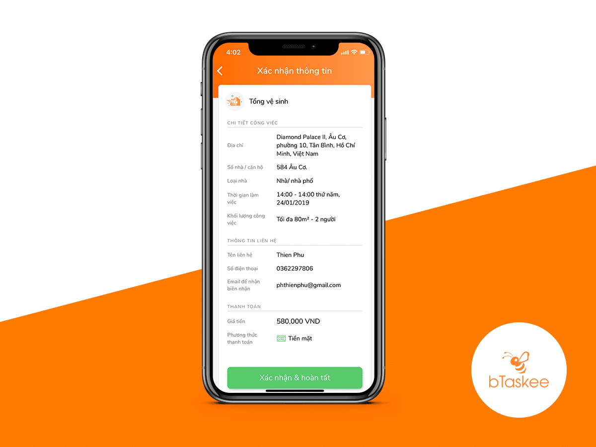 Bước 4: Kiểm tra thông tin và chọn “Hoàn tất” để đặt lịch gói dọn dẹp tổng vệ sinh trên ứng dụng bTaskee.