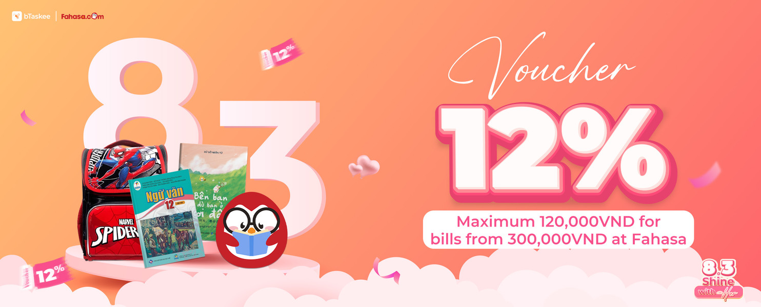 Voucher 12% discount (up to 120,000VND) for orders from 300,000 VND at Fahasa