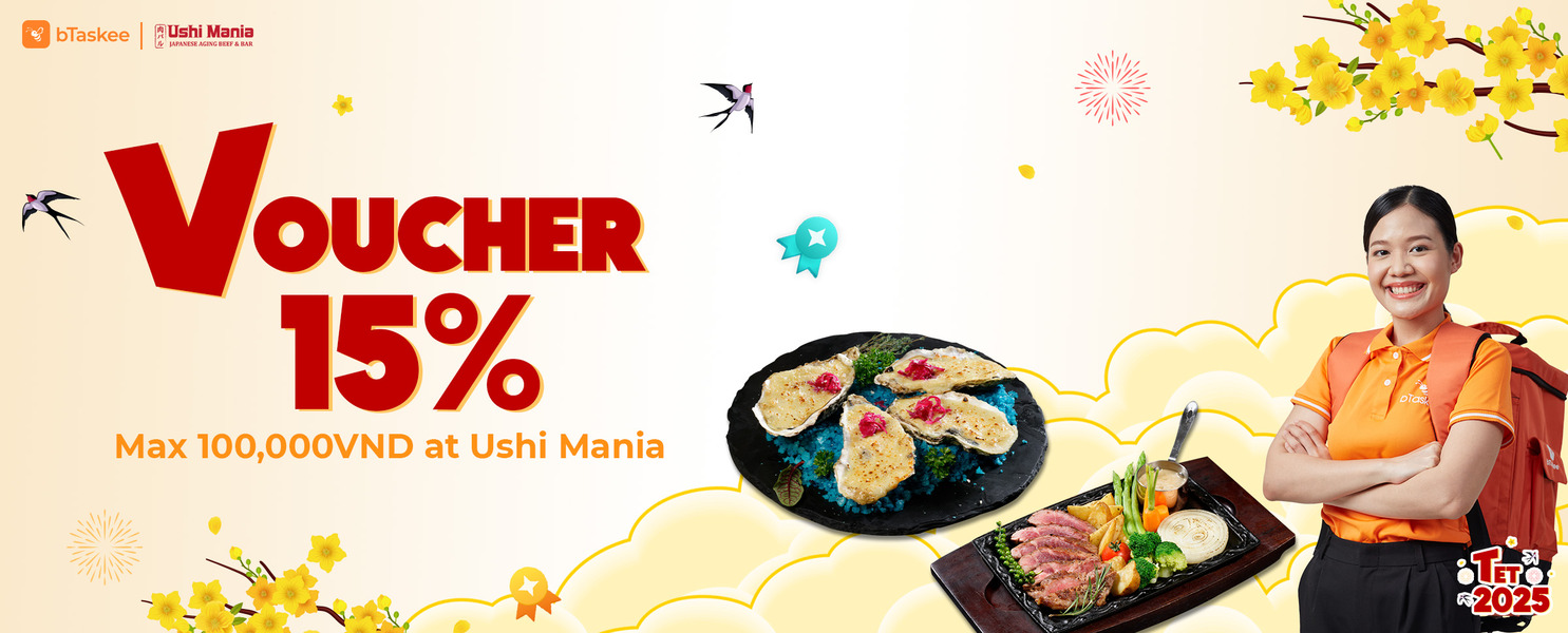 Voucher for 15% off, up to 100,000đ, for dining at Ushi Mania.