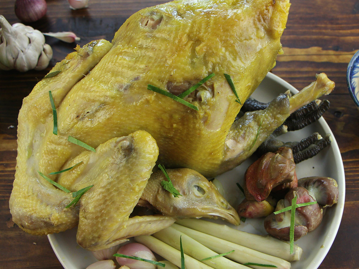 - Make a spice mixture for marinating the chicken, including crushed lemongrass, crushed lime leaves, salt, seasoning, cooking oil.