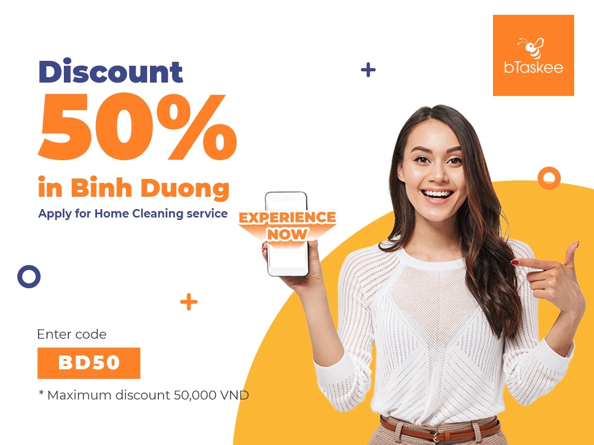 Open bTaskee application and Upload a cleaning task on the application to get a discount of 50% (maximum 50.000 VND).
