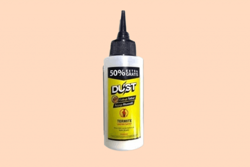 Dust Termite merupakan produk pembasmi rayap bubuk yang dapat membasmi rayap sampai ke sarangnya. Obat anti rayap ini cukup ampun membunuh rayap yang ada di rumah serta cukup aman dan mudah digunakan. Caranya kamu bisa menaburkan langsung ke sarang rayap atau campurkan bubuk dengan air lalu semprotkan atau oleskan ke area yang banyak rayap. Produk ini akan bekerja dalam 7-10 hari dengan harga sekitar Rp. 75.000 per botol.