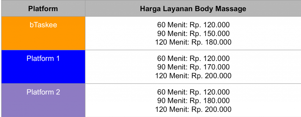 Pastikan untuk mempertimbangkan kualitas layanan dengan harga yang ditawarkan agar mendapatkan hasil yang memuaskan. Berikut ini perbadningan beberapa harga pijat panggilan dari layanan bTaskee dengan layanan lainnya