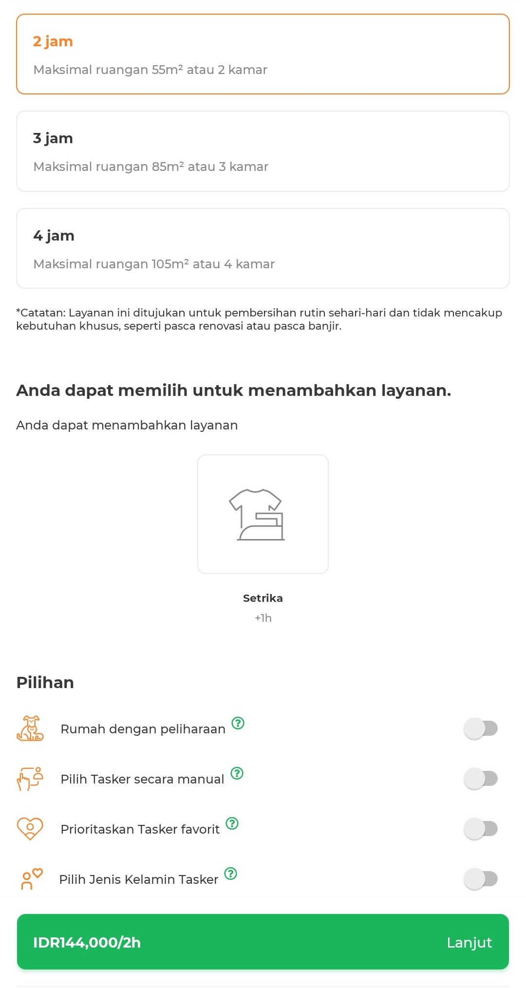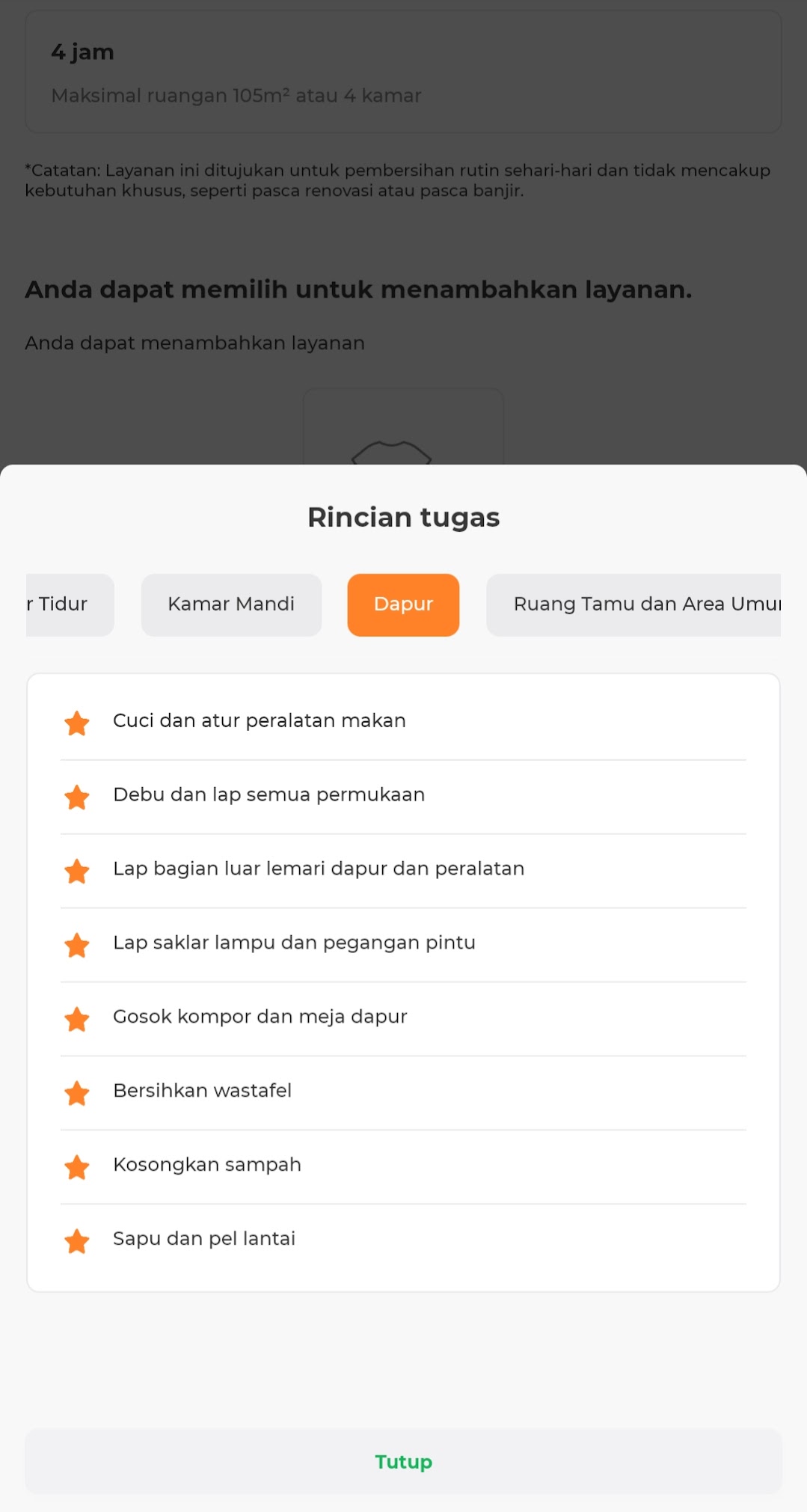 Dengan layanan ini, kamu bisa melakukan pembersihan di beberapa ruangan rumah dengan menyapu, mengepel, mengelap permukaaan dan buang sampah. Bagi kamu pengguna baru bTaskee kamu bisa masukkan kode promo BTASKEERT untuk dapatkan potongan harga sebesar Rp48.000. Pastikan kamu memasukkan kode promo tersebut saat checkout agar diskon dapat diterapkan.
