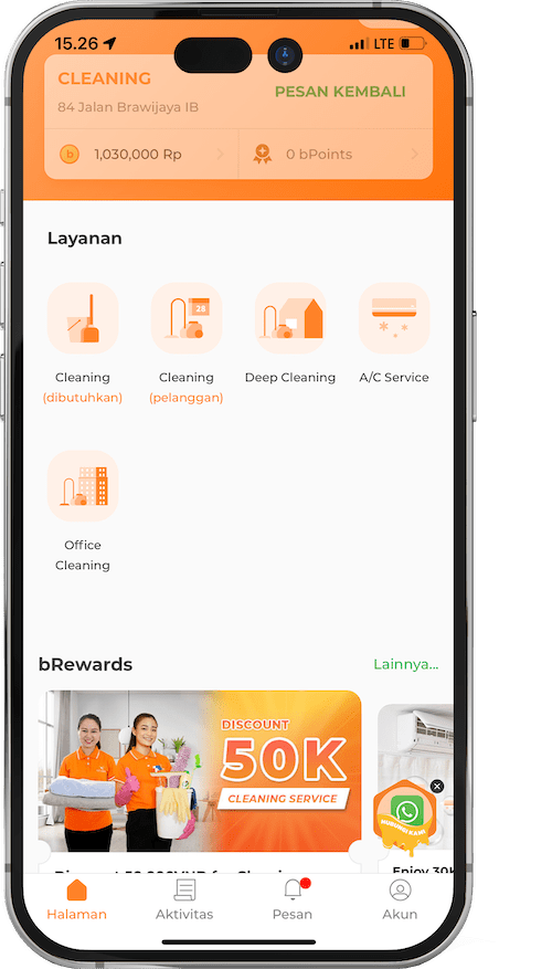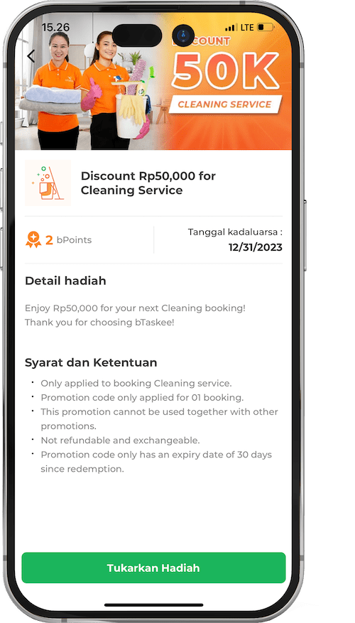 Contohnya: Ketika Anda memesan layanan membersihkan rumah selama 03 jam dengan harga 180.000 IDR dan mendapatkan diskon sebesar 30.000, poin bPoints yang terakumulasi akan didasarkan pada harga akhir 180.000 – 30.000 = 150.000.