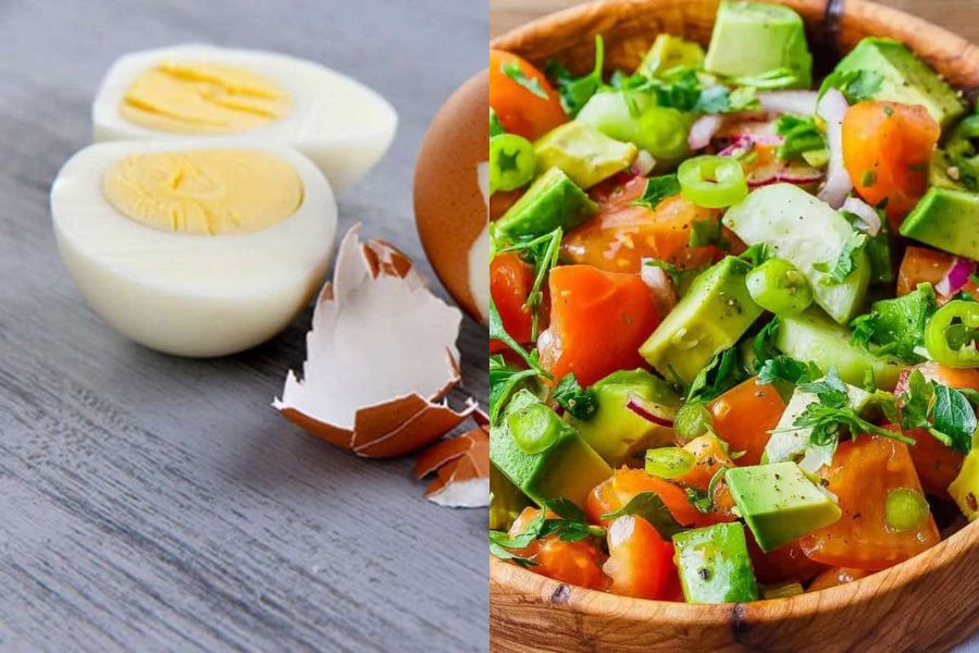 - Sáng: Trứng luộc (78 calo) + salad rau quả (80 – 100 calo)