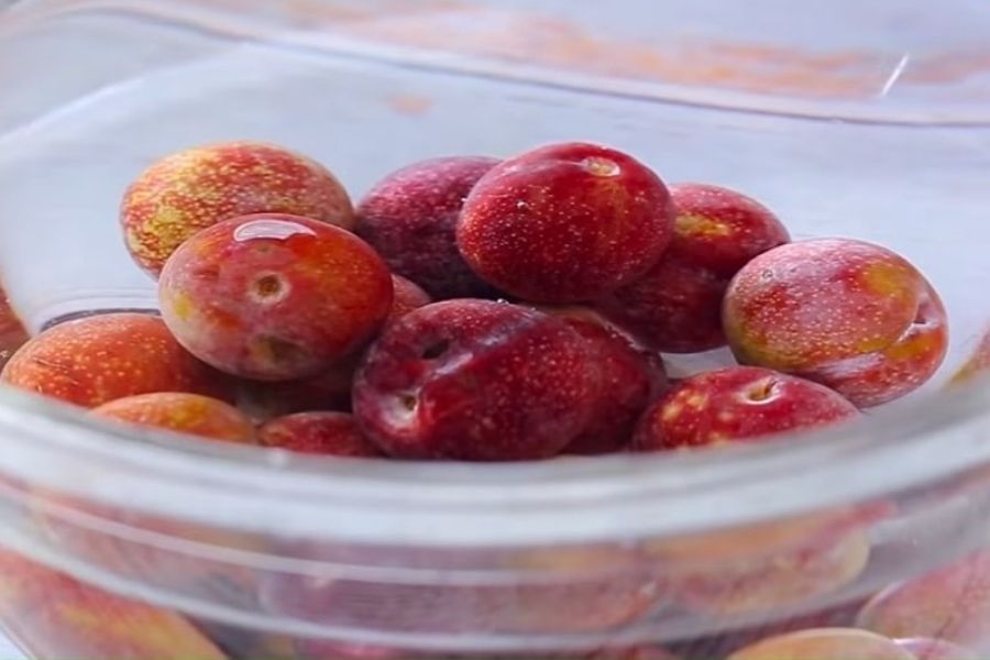 Sau khi mua mận về, chị em tiến hành rửa sạch với nước và ngâm mận trong nước muối loãng khoảng 15 phút. Sau đó vớt mận ra rổ để ráo nước, ngọt hết phần vỏ mận đi, có thể cắt quả mận ra làm đôi hoặc để nguyên tùy vào sở thích mỗi người.