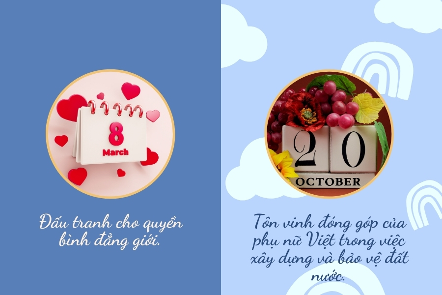 Ngày 8/3 là ngày Quốc tế Phụ nữ có nguồn gốc từ Mỹ, nhằm kỷ niệm phong trào đấu tranh cho bình đẳng giới trên toàn cầu. Trong khi đó, ngày 20/10 là ngày Phụ nữ Việt Nam, có ý nghĩa tôn vinh và tri ân những cống hiến to lớn của người phụ nữ Việt trong sự nghiệp xây dựng, phát triển và bảo vệ Tổ quốc.