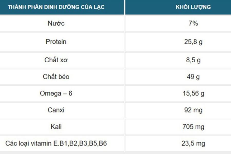 Trong 100g lạc sẽ chứa khoảng 567 calo và các thành phần khác như: