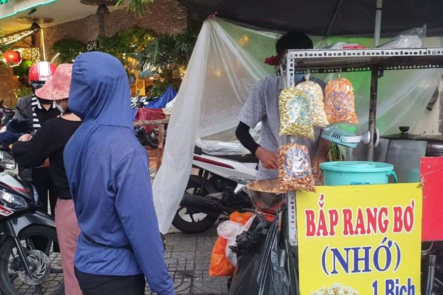 2 xe bán bắp rang bơ trước nhà sách Fahasa Thủ Đức giản đơn nhưng vẫn nức tiếng với hương vị thơm ngon, béo ngậy. Bắp tại đây có đa dạng các vị như caramel, cacao, matcha, phô mai và bơ. Các loại sốt này bao phủ trọn vẹn từng hạt bắp, đậm vị.