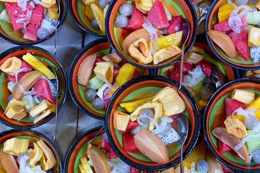 Một xô trái cây ở đây vô cùng đầy đặn, đa dạng các loại trái cây khác nhau. Trái cây được ướp lạnh, ở giữa có thêm miếng bánh sữa chua dẻo mịn, núng nính đầy hấp dẫn.
