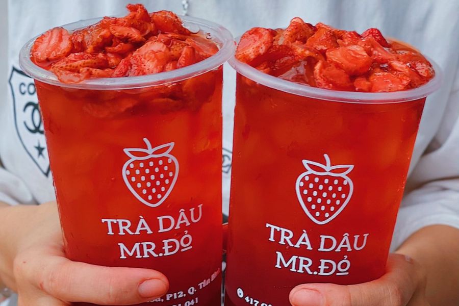 Trà dâu Mr. Đỏ cũng là một địa điểm ăn vặt Thủ Đức được nhiều bạn trẻ yêu thích. Quán trà dâu chinh phục khách hàng bởi hương vị thơm ngon, dễ uống cùng mức giá hợp lý.