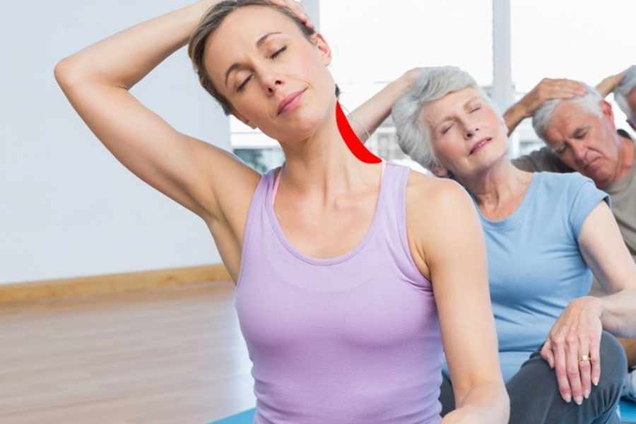 - Từ từ nghiêng đầu sang phải để kéo căng cơ cổ bên trái, tránh kéo căng quá mức sẽ phản tác dụng.