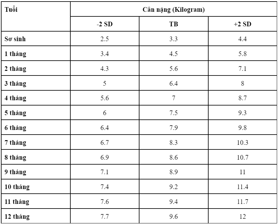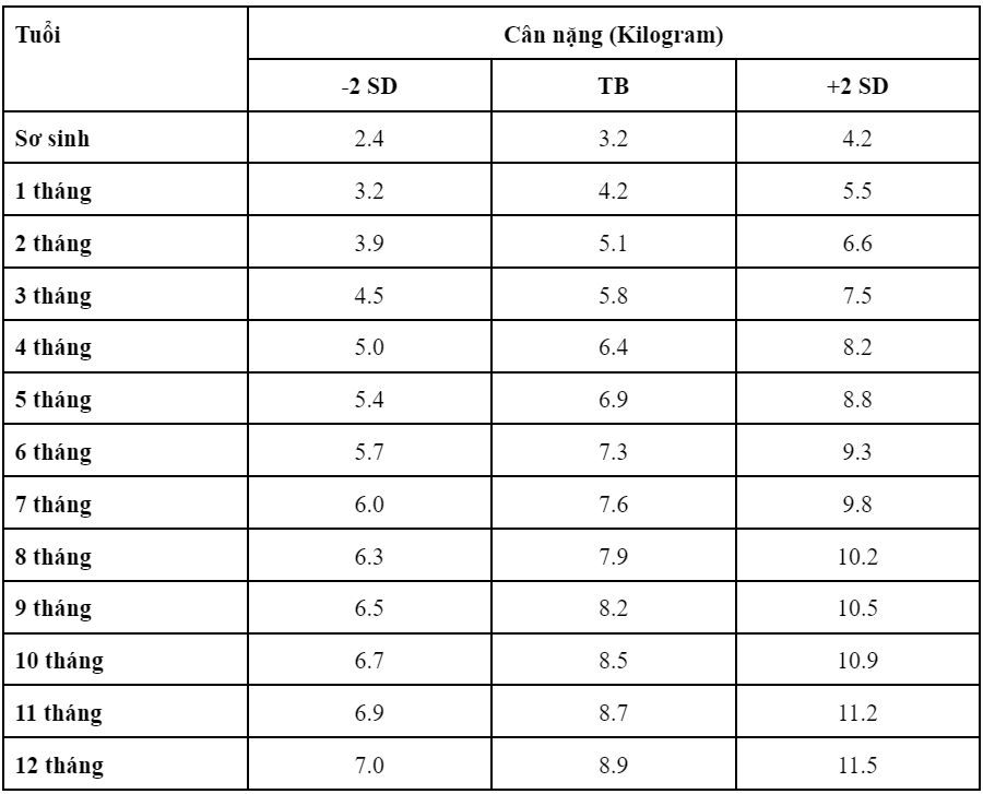 - Phần cân nặng tiêu chuẩn có 3 cột: -2 SD (Chỉ số suy dinh dưỡng, thiếu cân), TB (Chỉ số cân nặng trung bình), +2 SD (Chỉ số thừa cân, béo phì)
