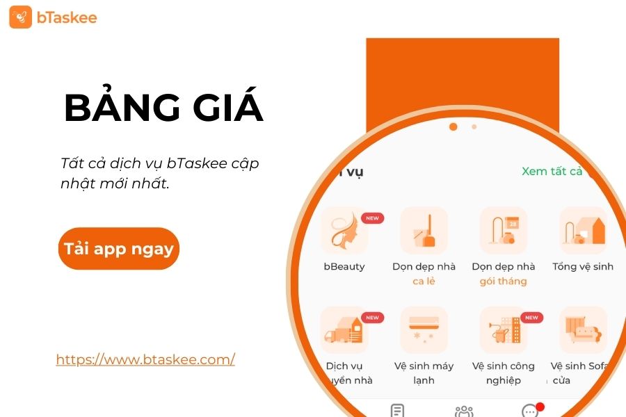 Tham khảo bảng giá chi tiết các dịch vụ của bTaskee tại TP.HCM (05/2025). Lưu ý giá có thể thay đổi theo khu vực và thời điểm. Đặt lịch trực tiếp trên ứng dụng bTaskee để nhận giá chính xác, minh bạch ngay từ đầu.