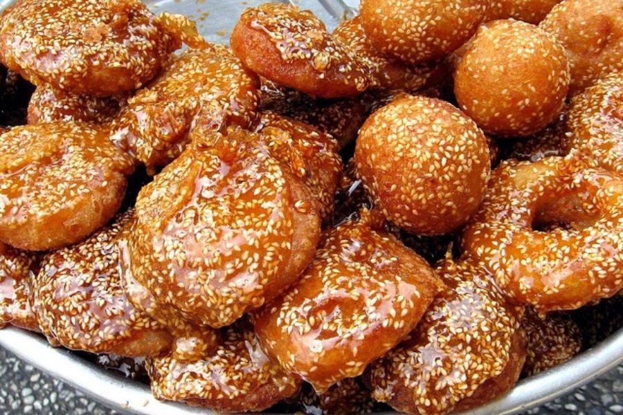 - Bánh rán vừng: Lớp vỏ vàng óng được lăn qua với hạt vừng, làm cho bánh càng trở nên hấp dẫn nhưng bánh chứa khoảng 357 calo/100g.