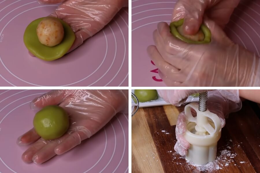 - Đặt viên nhân vào giữa lớp vỏ bánh, dùng tay miết lớp bột để bao kín nhân bên trong và vo tròn.