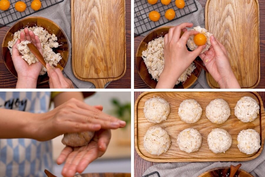 - Đặt 1 quả trứng muối đã nướng vào chính giữa phần nhân đã ấn dẹp rồi dùng tay bọc kín lại thành viên tròn.