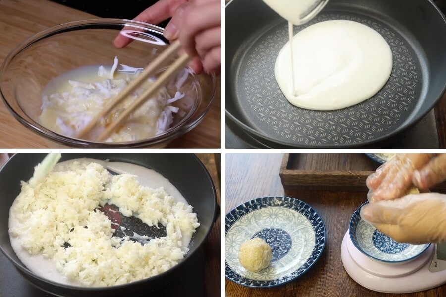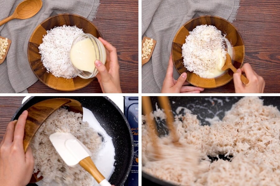- Đổ nước cốt dừa vào chảo chống dính và đun với mức lửa vừa. Khi nước bắt đầu sôi thì hạ nhỏ lửa và cho hỗn hợp dừa nạo + sữa đặc vào đảo đều đến khi cạn nước.