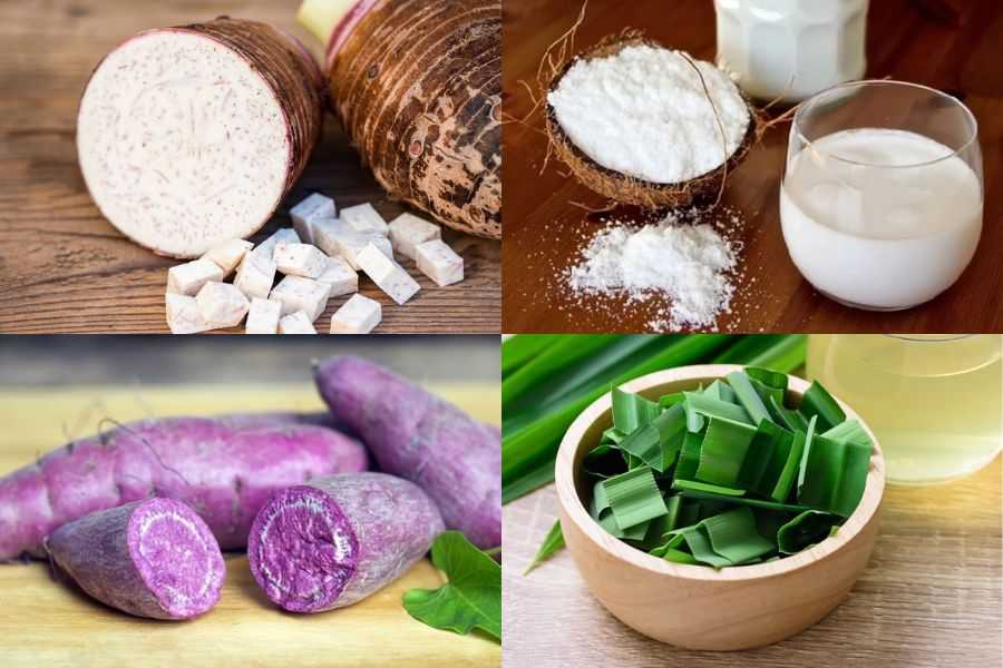 - Bước 2: Cắt khoai môn và khoai lang tím thành nửa hình tròn. Đem lá dứa rửa sạch và thái khúc.