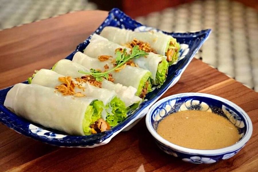 Bánh ướt gà xé là loại bánh được cuốn kèm với gà luộc xé sợi, các loại rau sống như rau húng, diếp cá, giá đỗ, rau mùi,… và chấm cùng nước mắm chua ngọt.