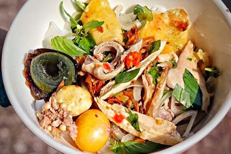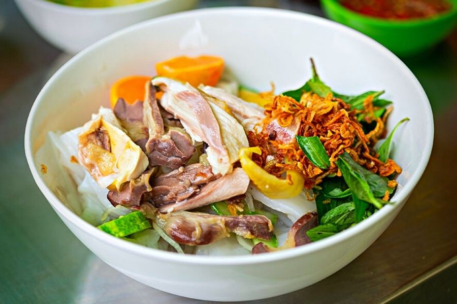 - Bánh ướt gà xé: Ăn kèm gà luộc xé sợi nhỏ, hành phi, rau sống và chấm cùng với nước mắm pha chua ngọt.