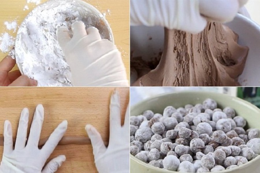 Lấy một ít bột đã nhào cho vào lòng bàn tay hoặc lên mặt phẳng để se thành từng sợi nhỏ. Cắt bột thành từng viên nhỏ rồi dùng tay nặn tròn thành hạt trân châu.