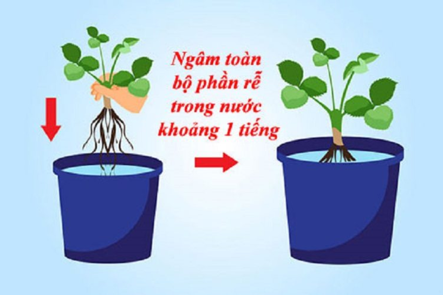 Khi mua về, cây dâu tây thường được bảo quản trong những túi bóng hoặc thùng xốp. Bạn hãy lấy chúng ra và tiến hành ngâm phần rễ vào nước chừng 1 giờ. Nó vừa giúp cấp ẩm đầy đủ cho cây vừa giúp xóa bỏ chấn động khi cây trồng xuống đất.