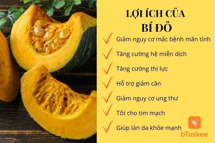 Bí đỏ – một loại thực phẩm rất quen thuộc trong các bữa ăn gia đình. Bí đỏ hay bí ngô rất đa dạng trong việc chế biến. Nhưng bạn đã biết bí đỏ có tác dụng gì đối với sức khỏe chưa? Nếu chưa thì bTaskee sẽ giới thiệu đến bạn những thông tin về bí đỏ qua bài viết sau!
