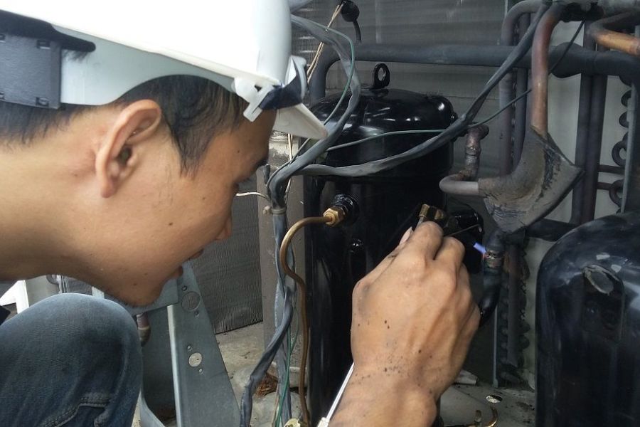 - Khắc phục rò rỉ gas nếu có (thường do mối hàn, gioăng cao su bị hở). Thợ kỹ thuật sẽ kiểm tra và sửa chữa các vị trí rò rỉ gas bằng cách hàn lại hoặc thay thế gioăng cao su.