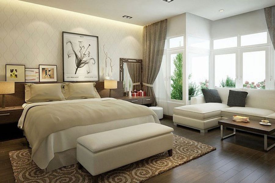 Bố trí bọc sofa văng dài, sofa đơn cùng bàn nhỏ để thư giãn nghe nhạc hoặc đọc sách sẽ mang lại những cảm xúc khó tả. Tạo một không gian thư giãn trong phòng ngủ có thể giúp giảm căng thẳng sau một ngày dài làm việc.