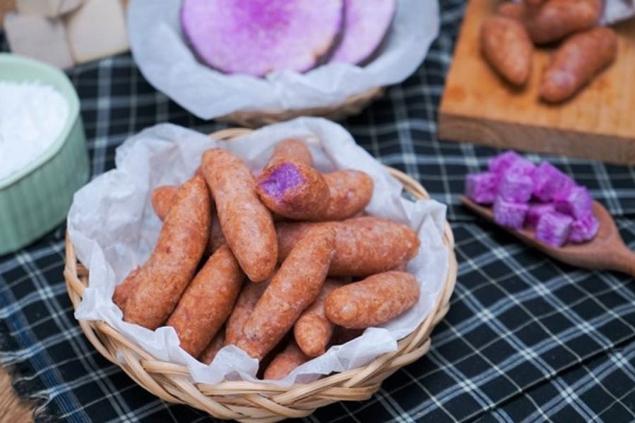 Tiếp tục một món ăn vặt khoái khẩu được làm từ bột mì mà bạn nên thử làm đó chính là bánh khoai mỡ. Khoai mỡ sau khi được luộc chín, nghiền nhỏ sẽ trộn cùng bột mì và các phụ liệu. Sau đó chiên vàng trong chảo ngập mỡ.