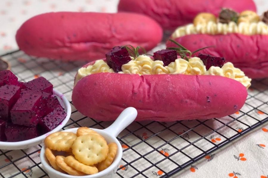 Thay vì nhào bột mì với nước trắng thì bánh mì Thanh Long sẽ được nhào bột cùng sinh tố Thanh Long xay nhuyễn, tạo ra hỗn hợp bột bánh có màu đỏ tía bắt mắt.