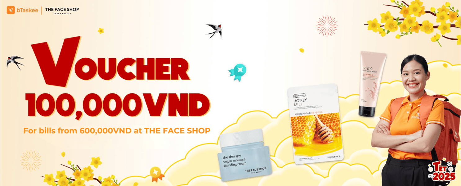 Chào Xuân 2025 với diện mạo rực rỡ! Đừng bỏ lỡ cơ hội đặc biệt từ bTaskee kết hợp cùng THE FACE SHOP để mang đến cho bạn một mùa Tết không “mụn” phiền, làn da sáng khỏe, tự tin đón năm mới.
