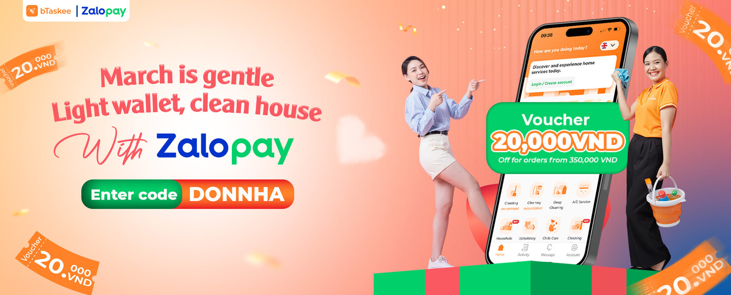 Voucher giảm 20,000đ cho đơn từ 350,000đ khi sử dụng dịch vụ bTaskee và thanh toán qua Zalopay.