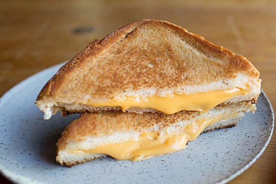 - Bước 3: Cho dầu ăn, bơ lạt vào chảo. Cho bánh mì sandwich vào áp chảo 2 mặt vàng đều. Sau đó kẹp phô mai vào giữa 2 lát bánh mì. Để bánh mì khoảng 20 giây trong chảo để phô mai chảy ra.