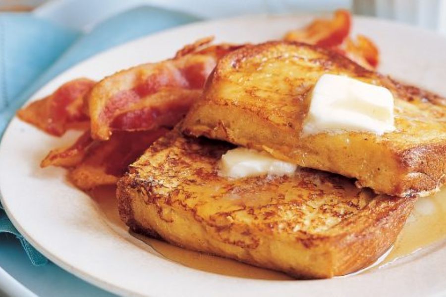 - Bước 2: Cho một chút dầu ăn, bơ lạt vào chảo và đun chảy. Nhúng từng miếng bánh mì vào hỗn hợp trứng sữa khoảng 20 – 30 giây rồi cho vào chảo rán. Mỗi mặt bánh mì áp chảo khoảng 40 – 60 giây để bánh hơi giòn rụm, ngon miệng hơn.
