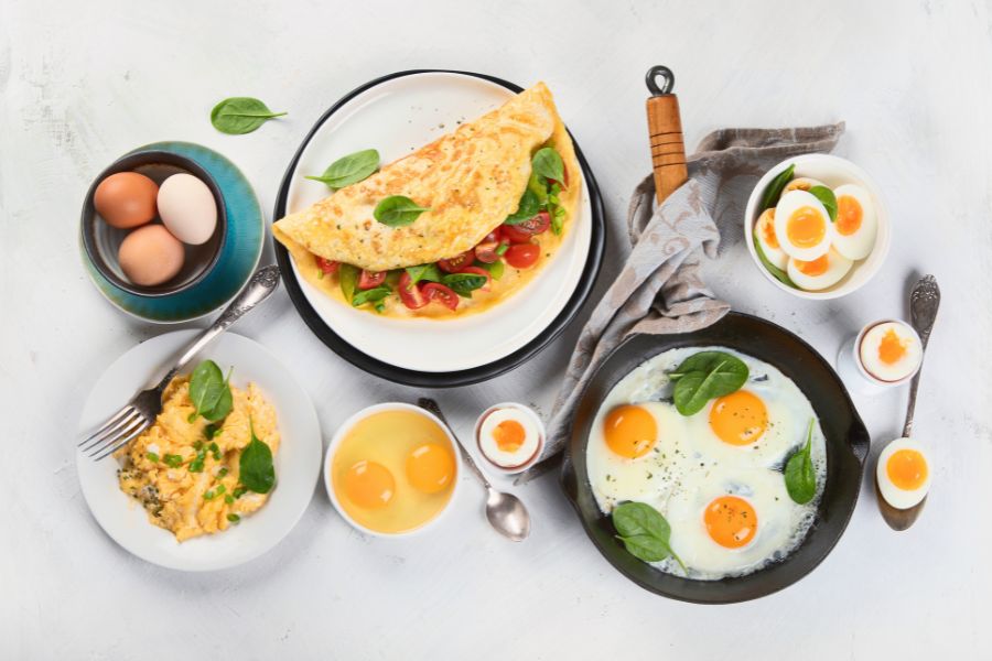 - Trứng: Trứng là nguồn protein và chất béo chất lượng cao. Có thể ăn trứng chiên hoặc trứng đúc kèm với bánh mì hoặc cơm.