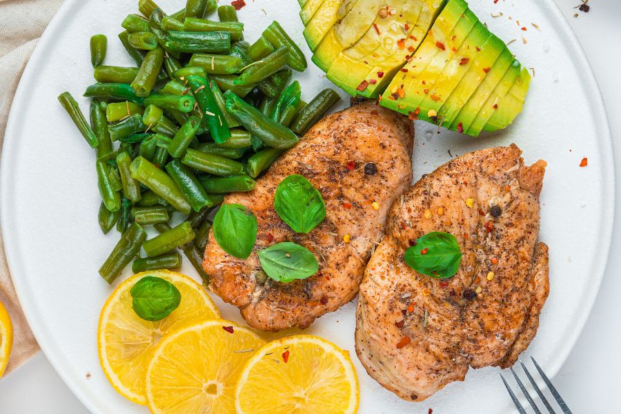 Nên ăn những món ăn giàu protein như trứng, thịt gà, cá hồi. Ngoài ra nên ăn các loại hạt và rau để bổ xung chất xơ như hạt óc chó, rau xanh.