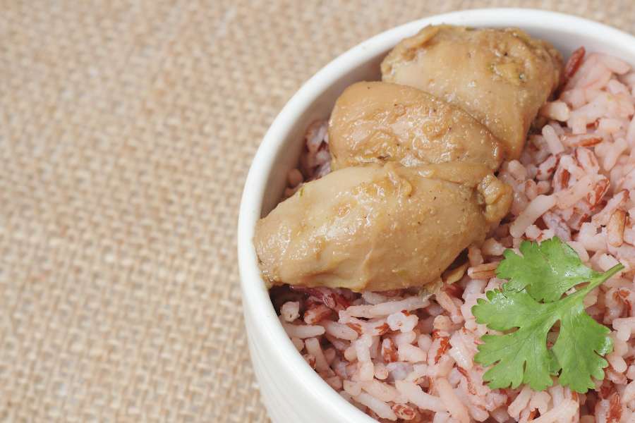 Bữa trưa gồm cơm gạo lứt và ức gà