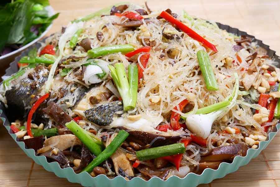 - Đặt cá vào trong nồi hấp, cho bún tàu và nấm mèo lên trên.