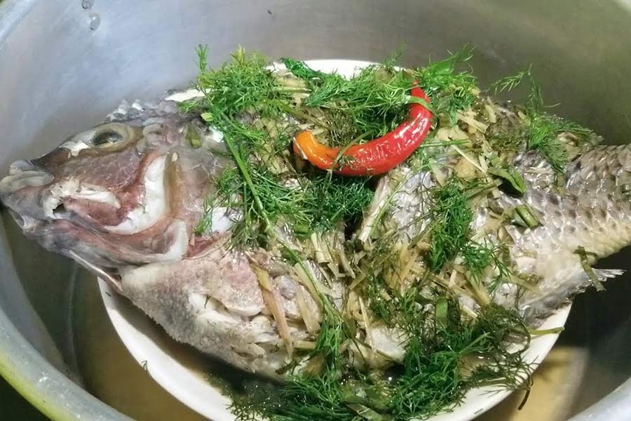 - Lấy phần ngọn sả đập dập, rau thì là, ít ngọn hành lá để lên giá hấp rồi đặt cá lên trên.