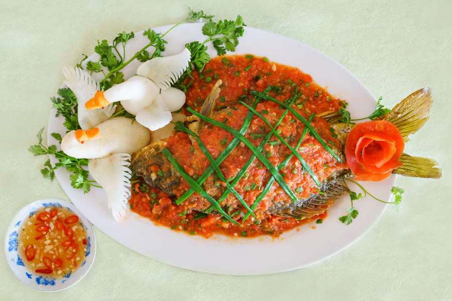 - Rắc hành lá và thì lá lên rồi tắt lửa là xong. Gắp cá ra đĩa, chan nước sốt cà chua sền sệt lên trên là có thể thưởng thức.