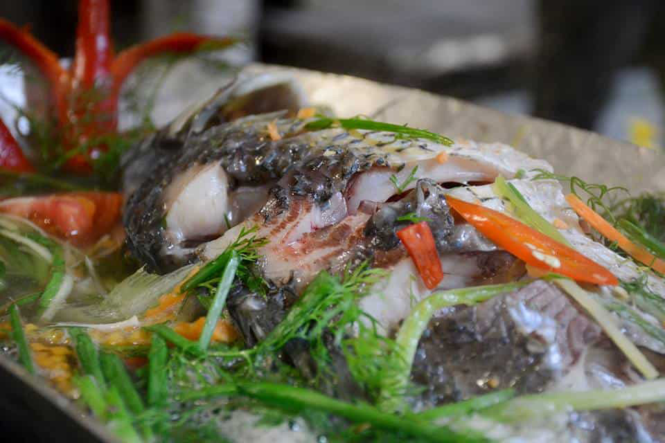 - Hấp cá khoảng 20 – 30 phút tùy kích thước, mở nắp rắc ớt lên trên rồi hấp thêm khoảng 5 phút nữa là xong.